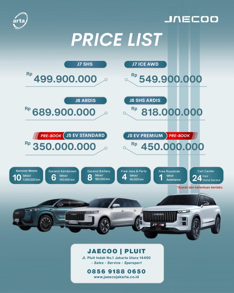 HARGA JAECOO HARGA JAECOO Temukan kendaraa yang sesuai dengan kebutuhan Anda! TYPE HARGA J8 Ardis 689.900.000 J8 SHS Ardis 818.000.000 J7 AWD 549.900.000 J7 SHS 499.900.000 J5 EV Standard 350.000.000 J5 EV Premium 450.000.000